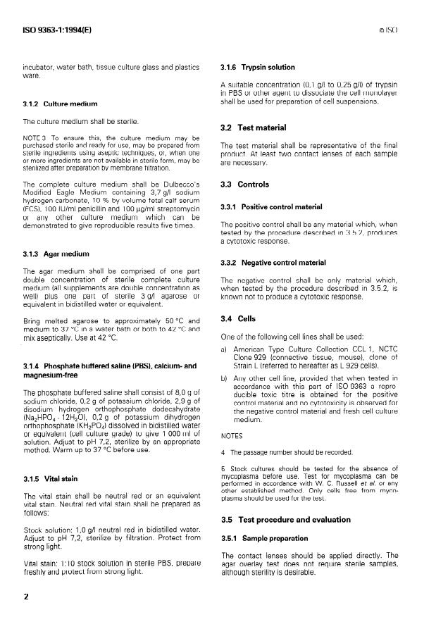 La présente partie de l'ISO 9363 prescrit deux méthodes in vitro pour la détermination de la cytotoxicité des matériaux des lentilles de contact:- l'essai de diffusion à travers l'agar; et- l'essai d'inhibition de la croissance cellulaire.Ces essais ont pour objet principal de détecter la présence de substances cytotoxiques extractibles dans ou sur les lentilles de contact.NOTES:1 L'attention est attirée sur l'ISO 10993-5.2 Il est recommandé d'effectuer au moins un essai in vitro pour une évaluation préclinique des lentilles de contact neuves. On peut utiliser l'un ou l'autre des deux essais in vitro suivants.