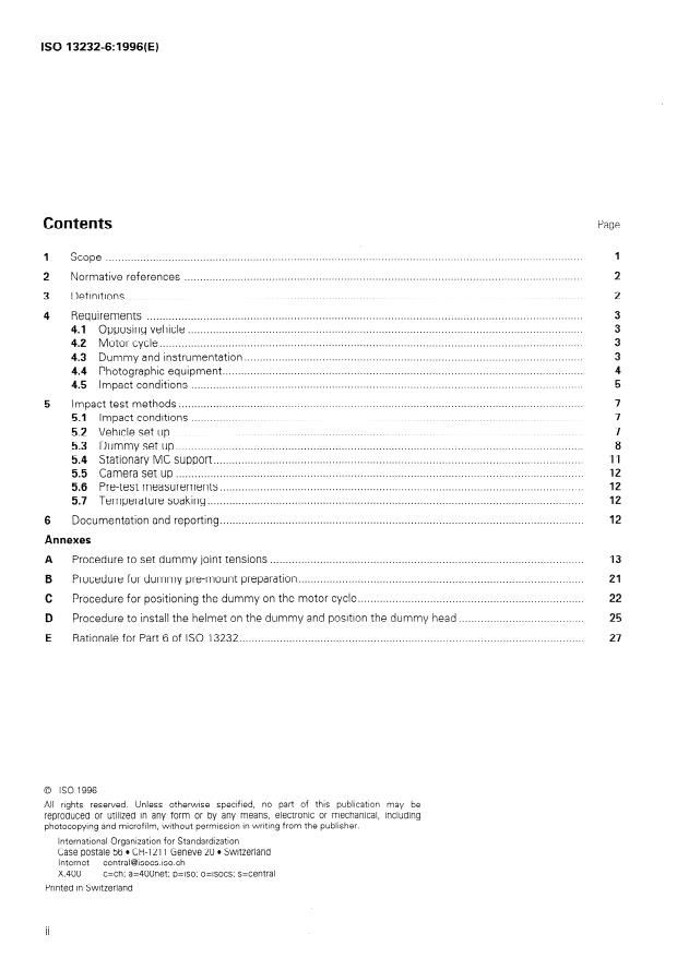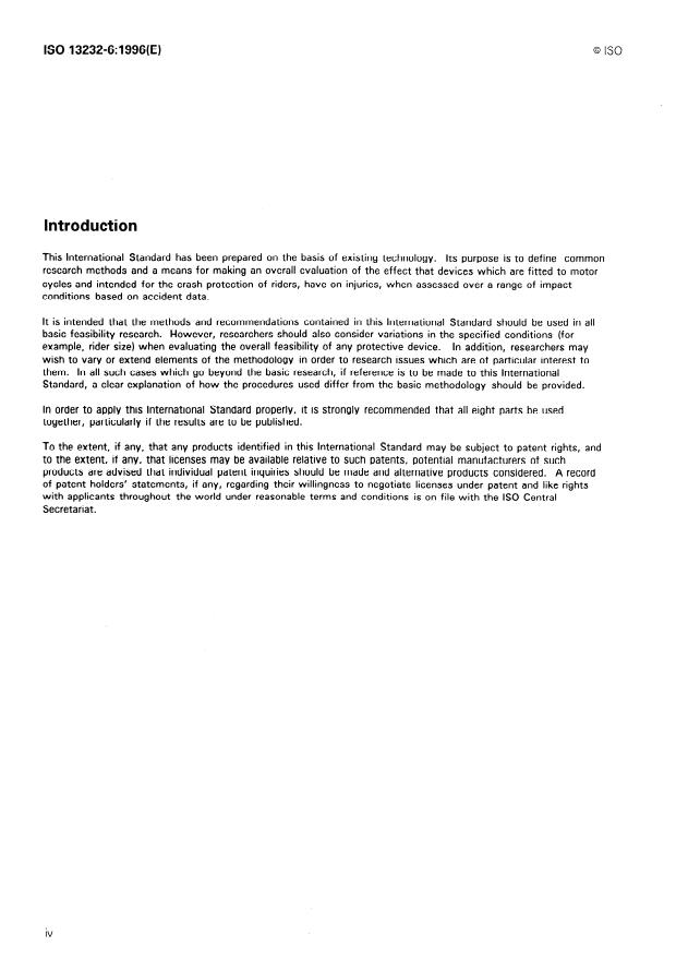 ISO 13232-6:1996 is a standard published by the International Organization for Standardization (ISO). Its full title is "Motorcycles — Test and analysis procedures for research evaluation of rider crash protective devices fitted to motorcycles — Part 6: Full-scale impact-test procedures". This standard covers: Specifies minimum requirements for paired comparison tests, the preparation of the dummy, motor cycle, and opposing vehicle, the repeatability and reproducibility of impact test conditions, realistic and representative impact conditions for full-scale impact tests and a means to verify analytical evaluations such as computer simulation.