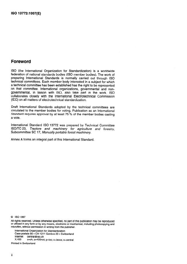 ISO 13772:1997 is a standard published by the International Organization for Standardization (ISO). Its full title is "Forestry machinery — Portable chain-saws — Non-manually actuated chain brake performance". This standard covers: Forestry machinery — Portable chain-saws — Non-manually actuated chain brake performance