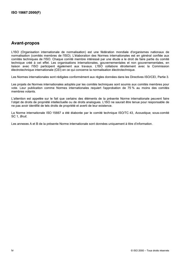 ISO 15667:2000 is a standard published by the International Organization for Standardization (ISO). Its full title is "Acoustics - Guidelines for noise control by enclosures and cabins". This standard covers: La présente Norme internationale traite des performances des encoffrements et des cabines destinés à la réduction du bruit. Elle précise les exigences acoustiques et d'utilisation qui doivent être convenues entre le fournisseur ou le constructeur, et l'utilisateur de ces encoffrements et cabines. La présente Norme internationale s'applique à deux types d'encoffrements; et de cabines acoustiques, comme suit.a) Les cabines pour la protection des opérateurs contre le bruit: les cabines autoporteuses et les cabines fixées à des machines (par exemple, véhicules, grues).b) Les encoffrements autoporteurs couvrant ou enveloppant des machines. Ces encoffrements dont une fraction inférieure à 10 % de leur surface totale est ouverte et non traitée du point de vue acoustique sont le principal objet de la présente Norme internationale.Dans la présente Norme internationale, l'accent est mis sur les constructions légères. Toutefois, les structures épaisses, massives, par exemple des murs en briques, ne sont pas exclues.Les encoffrements et cabines dont plus de 10 % de la surface est ouverte et non traitée appartiennent à la catégorie des encoffrements partiels. Ils ne font pas l'objet de la présente Norme internationale.Un troisième type d'encoffrement, les encoffrements; intégrés qui font partie de la machine et qui y sont solidement fixés, ne fait pas l'objet de la présente Norme internationale.