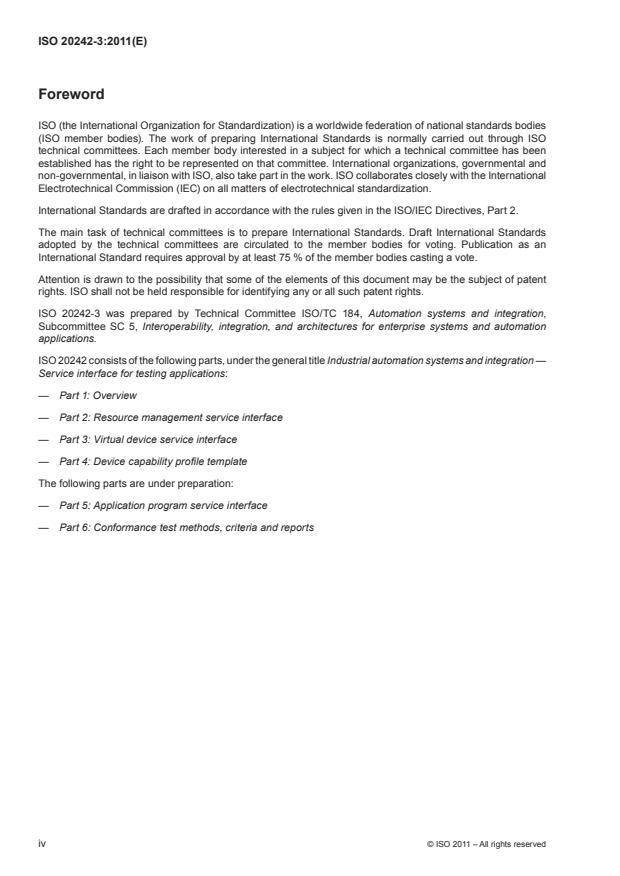 ISO 20242-3:2011 - "Industrial automation systems and integration - Service interface for testing applications - Part 3: Virtual device service interface" defines the Virtual Device Service Interface (VDSI) used to communicate with virtual devices that represent capabilities of software modules and physical devices. VDSI is accessed via Resource Management Services as defined in ISO 20242-2. The standard describes service primitives (request/confirm, indication/response), a VDSI object model (virtual devices, function objects, communication objects), service procedures, operating states, service results and implementation guidance.