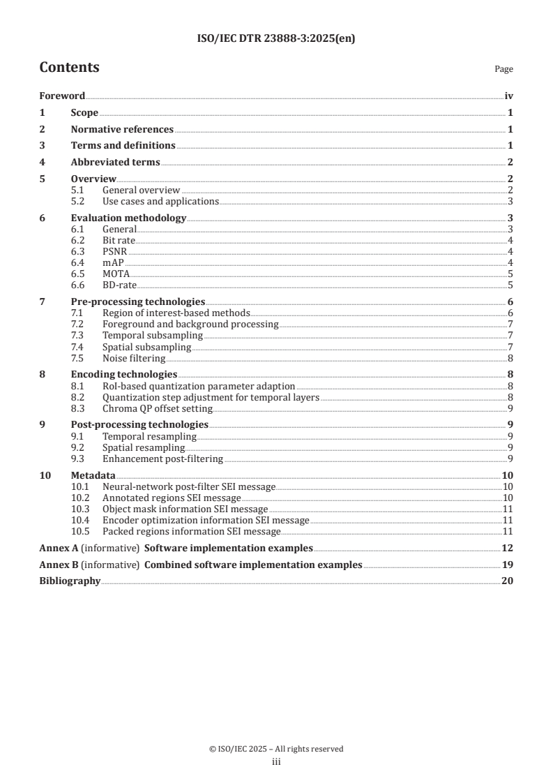 ISO/IEC TR 23888-3 is a technical report developed by the International Organization for Standardization (ISO) and the International Electrotechnical Commission (IEC) focusing on artificial intelligence (AI) for multimedia. Specifically, this part addresses the optimization of encoders and receiving systems for machine analysis of coded video content. As video analysis by machines becomes increasingly critical in diverse fields like surveillance, autonomous driving, and content indexing, this report summarizes recent innovations that improve how video is encoded and processed to enhance machine consumption.