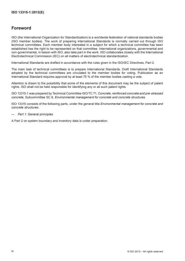 ISO 13315-1:2012 is a standard published by the International Organization for Standardization (ISO). Its full title is "Environmental management for concrete and concrete structures — Part 1: General principles". This standard covers: 1 Scope This part of ISO 13315 provides a framework and basic rules on environmental management related to concrete and concrete structures. This includes the assessment of the environmental impacts and methods of implementing environmental improvement based on the assessment. This part of ISO 13315 is used when assessing the environmental impacts and implementing the environmental management of concrete and concrete structures for the environmental consideration in activities related to the production of concrete constituents, the production, recycling and disposal of concrete, and the design, execution, use and demolition of concrete structures. It is applied for their entire lifecycles, respective stages of the lifecycles, or certain ranges of the lifecycles. This part of ISO 13315 is relevant to newly produced concrete and newly constructed concrete structures, and also existing concrete and concrete structures. This part of ISO 13315 applies not only to single concretes but also to concrete families and not only to single concrete structures but also to concrete structure complexes. For materials other than concrete, the related ISO standards are applied where available. In the case where no ISO standard is available, such materials are appropriately dealt with referring to this part of ISO 13315 and the normative references. The environments covered by this part of ISO 13315 include global, regional and local environments. The indoor pollution of buildings and the environments for workers in concrete producing plants and on concrete structure construction sites are not specifically covered by this part of ISO 13315. This part of ISO 13315 does not directly deal with the environmental impacts resulting from the operation of equipment installed in concrete structures. However, the special properties of concrete and concrete structures affecting the operational efficiency of such equipment are considered in this part of ISO 13315. This part of ISO 13315 covers secondary effects of the production of concrete and execution of concrete structures. This part of ISO 13315 may also cover the economic and social effects of environmental consideration in the production of concrete and execution of concrete structures. NOTE 1 ISO 16814 is available for reference as a standard for the indoor pollution of buildings. NOTE 2 The working environments of plants and construction sites are generally prescribed by industrial safety and health laws. NOTE 3 In buildings, global warming substances are mainly emitted from energy consumption due to the operation of heating, ventilating and air-conditioning equipment. NOTE 4 The beneficial effects such as thermal mass and other functions of concrete and concrete structures may be taken into account. NOTE 5 The secondary effects of the production of concrete include the future possibility of leaching of heavy metals from concrete or the absorption of heavy metals from the environment, the effect of waste treatments on the environment, etc.