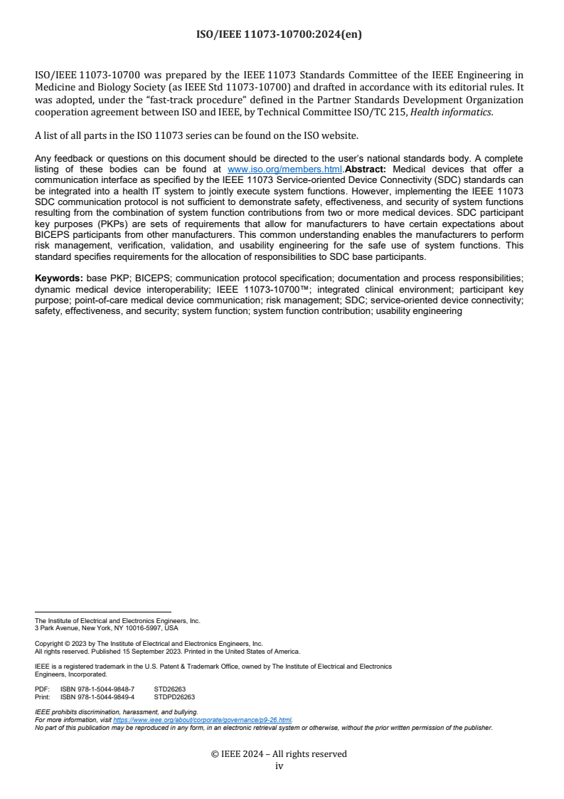 ISO/IEEE 11073-10700:2024 - Health informatics - Device interoperability - Part 10700 - defines the base requirements for participants in a Service‑oriented Device Connectivity (SDC) system. This first‑edition standard specifies a base set of Participant Key Purposes (PKPs): role‑based sets of product requirements that enable safe, effective, and secure interoperability of point‑of‑care medical devices (e.g., in ICU, OR and other acute care settings). The document addresses both product development process and technical requirements and clarifies allocation of responsibilities among SDC base participants to support system-level safety.
