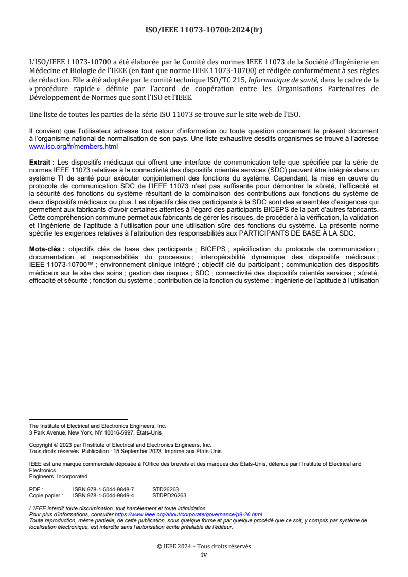 ISO/IEEE 11073-10700:2024 - Informatique de santé — Interopérabilité des dispositifs — Partie 10700: Communication entre dispositifs médicaux sur le site des soins — Norme relative aux exigences de base pour les participants à un système de connectivité de dispositifs orientée services (SDC) Released:16. 09. 2024