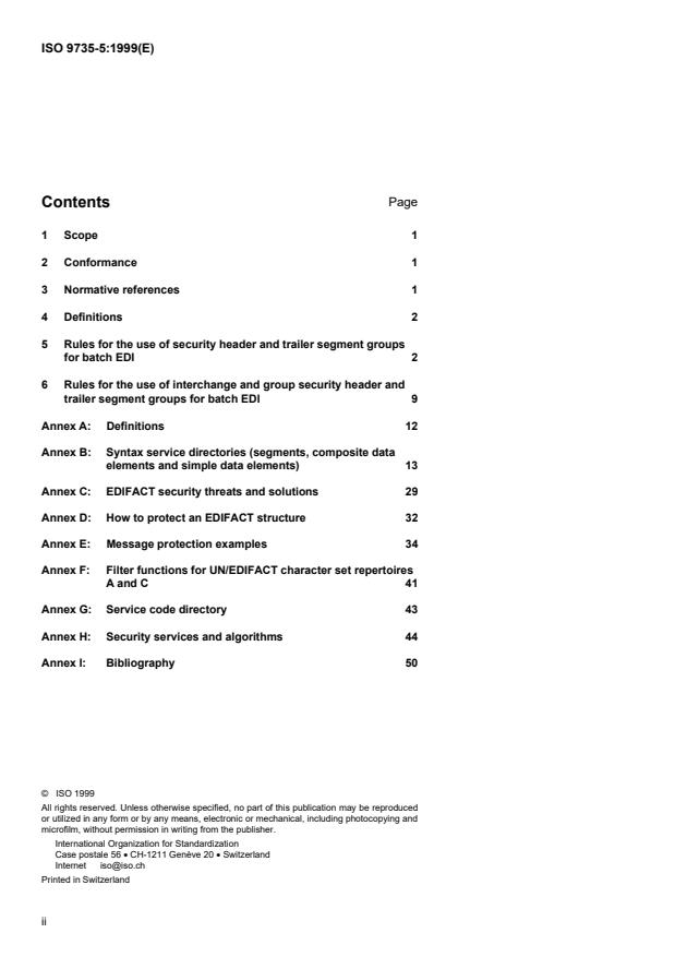 ISO 9735-5:1999 is a standard published by the International Organization for Standardization (ISO). Its full title is "Electronic data interchange for administration, commerce and transport (EDIFACT) — Application level syntax rules (Syntax version number: 4) — Part 5: Security rules for batch EDI (authenticity, integrity and non-repudiation of origin)". This standard covers: Electronic data interchange for administration, commerce and transport (EDIFACT) — Application level syntax rules (Syntax version number: 4) — Part 5: Security rules for batch EDI (authenticity, integrity and non-repudiation of origin)
