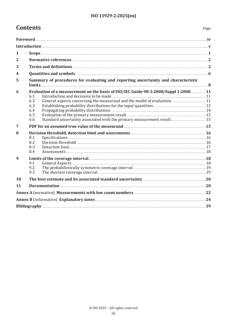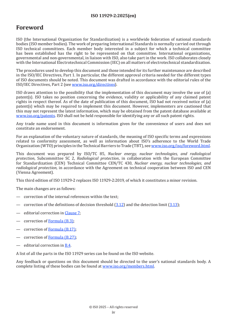 ISO 11929-2:2025 is a standard published by the International Organization for Standardization (ISO). Its full title is "Determination of the characteristic limits (decision threshold, detection limit and limits of the coverage interval) for measurements of ionizing radiation - Fundamentals and application - Part 2: Advanced applications". This standard covers: The ISO 11929 series specifies a procedure, in the field of ionizing radiation metrology, for the calculation of the “decision threshold”, the “detection limit” and the “limits of the coverage interval” for a non-negative ionizing radiation measurand when counting measurements with preselection of time or counts are carried out. The measurand results from a gross count rate and a background count rate as well as from further quantities on the basis of a model of the evaluation. In particular, the measurand can be the net count rate as the difference of the gross count rate and the background count rate, or the net activity of a sample. It can also be influenced by calibration of the measuring system, by sample treatment and by other factors. ISO 11929 has been divided into four parts covering elementary applications in ISO 11929-1, advanced applications on the basis of the GUM Supplement 1 in this document, applications to unfolding methods in ISO 11929-3, and guidance to the application in ISO 11929-4. ISO 11929-1 covers basic applications of counting measurements frequently used in the field of ionizing radiation metrology. It is restricted to applications for which the uncertainties can be evaluated on the basis of the ISO/IEC Guide 98-3 (JCGM 2008). In ISO 11929-1:2025, Annex A, the special case of repeated counting measurements with random influences is covered, while measurements with linear analogous ratemeters are covered in ISO 11929-1:2025, Annex B. ISO 11929-3 deals with the evaluation of measurements using unfolding methods and counting spectrometric multi-channel measurements if evaluated by unfolding methods, in particular, for alpha- and gamma‑spectrometric measurements. Further, it provides some advice on how to deal with correlations and covariances. ISO 11929-4 gives guidance to the application of ISO 11929, summarizes shortly the general procedure and then presents a wide range of numerical examples. Information on the statistical roots of ISO 11929 and on its current development may be found elsewhere[ REF Reference_ref_37 \r \h 30 08D0C9EA79F9BACE118C8200AA004BA90B0200000008000000110000005200650066006500720065006E00630065005F007200650066005F00330037000000 ][ REF Reference_ref_38 \r \h 31 08D0C9EA79F9BACE118C8200AA004BA90B0200000008000000110000005200650066006500720065006E00630065005F007200650066005F00330038000000 ]. ISO 11929 also applies analogously to other measurements of any kind especially if a similar model of the evaluation is involved. Further practical examples can be found, for example, in ISO 18589[ REF Reference_ref_8 \r \h 1 08D0C9EA79F9BACE118C8200AA004BA90B0200000008000000100000005200650066006500720065006E00630065005F007200650066005F0038000000 ], ISO 9696[ REF Reference_ref_9 \r \h 2 08D0C9EA79F9BACE118C8200AA004BA90B0200000008000000100000005200650066006500720065006E00630065005F007200650066005F0039000000 ], ISO 9697[ REF Reference_ref_10 \r \h 3 08D0C9EA79F9BACE118C8200AA004BA90B0200000008000000110000005200650066006500720065006E00630065005F007200650066005F00310030000000 ], ISO 9698[ REF Reference_ref_11 \r \h 4 08D0C9EA79F9BACE118C8200AA004BA90B0200000008000000110000005200650066006500720065006E00630065005F007200650066005F00310031000000 ], ISO 10703[ REF Reference_ref_12 \r \h 5 08D0C9EA79F9BACE118C8200AA004BA90B0200000008000000110000005200650066006500720065006E00630065005F007200650066005F00310032000000 ], ISO 7503[ REF Reference_ref_13 \r \h 6 08D0C9EA79F9BACE118C8200AA004BA90B0200000008000000110000005200650066006500720065006E00630065005F007200650066005F00310033000000 ], ISO 28218[ REF Reference_ref_14 \r \h 7 08D0C9EA79F9BACE118C8200AA004BA90B0200000008000000110000005200650066006500720065006E00630065005F007200650066005F00310034000000 ] and ISO 11665[ REF Reference_ref_15 \r \h 8 08D0C9EA79F9BACE118C8200AA004BA90B0200000008000000110000005200650066006500720065006E00630065005F007200650066005F00310035000000 ]. NOTE A code system, named UncertRadio, is available for calculations according t