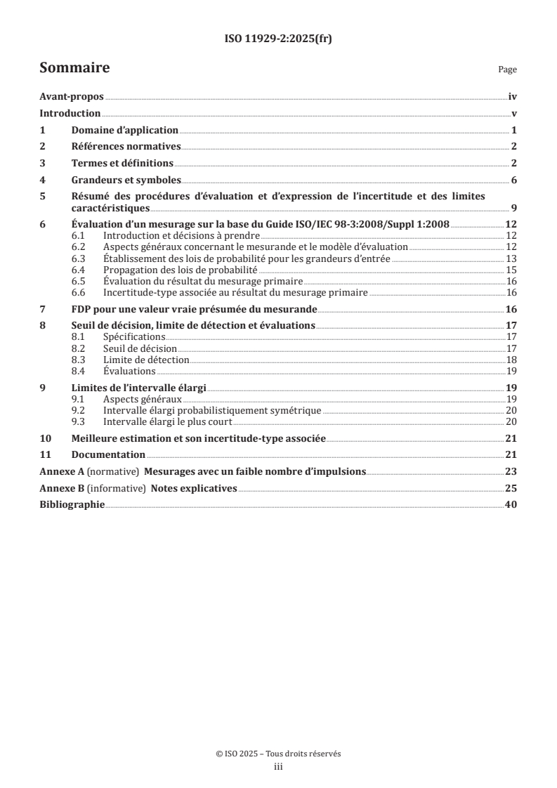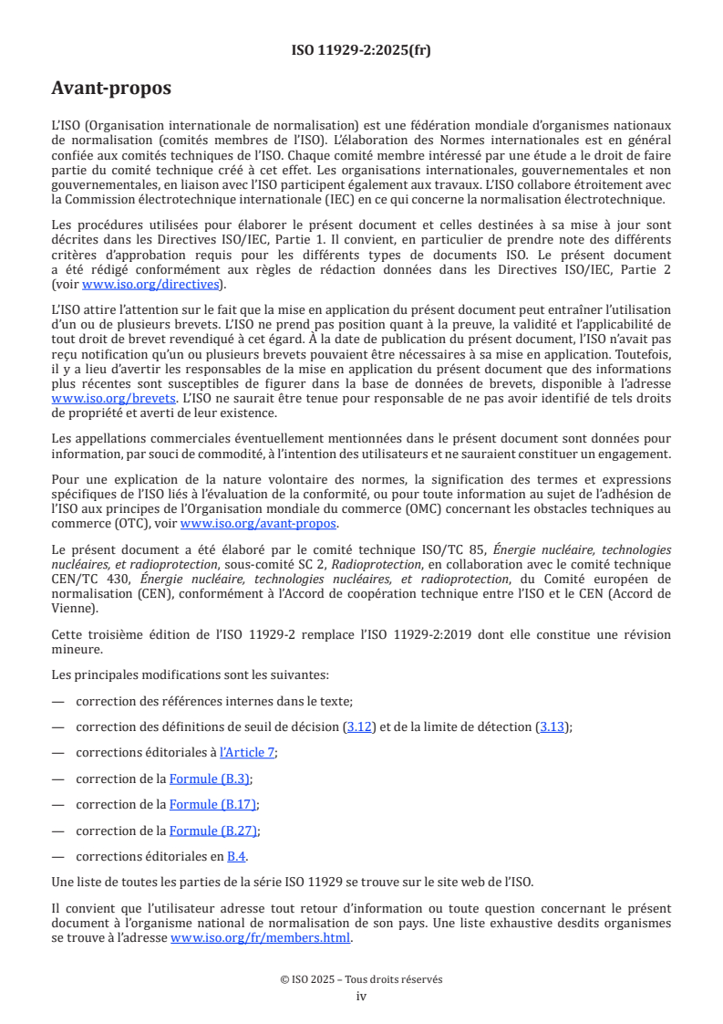 La série ISO 11929 spécifie une procédure applicable, dans le domaine de la métrologie des rayonnements ionisants, pour le calcul du «seuil de décision», de la «limite de détection» et des «limites de l’intervalle élargi» pour un mesurande de rayonnement ionisant non négatif, lorsque des mesurages par comptage sont effectués avec une présélection du temps ou du nombre d’impulsions. Le mesurande résulte d’un taux de comptage brut et d’un taux de comptage du bruit de fond ainsi que de grandeurs supplémentaires reposant sur un modèle d’évaluation. En particulier, le mesurande peut être le taux de comptage net défini comme la différence du taux de comptage brut et du taux de comptage du bruit de fond, ou l’activité nette d’un échantillon. Il peut également être influencé par l’étalonnage du système de mesure, par le traitement de l’échantillon et par d’autres facteurs. L’ISO 11929 a été scindée en quatre parties couvrant les applications élémentaires dans l’ISO 11929-1, les applications avancées reposant sur le Supplément 1 du GUM dans le présent document, les applications aux méthodes de déconvolution dans l’ISO 11929-3, et les recommandations d’application dans l’ISO 11929-4. L’ISO 11929-1 couvre les applications de base des mesurages par comptage souvent utilisées dans le domaine de la métrologie des rayonnements ionisants. Elle se limite aux applications pour lesquelles il est possible d’évaluer les incertitudes sur la base du Guide ISO/IEC 98-3 (JCGM 2008). L’ISO 11929-1:2025, Annexe A, traite du cas particulier des mesurages répétés par comptage avec des influences aléatoires, alors que l’ISO 11929-1:2025, Annexe B, couvre les mesurages avec des ictomètres analogiques linéaires. L’ISO 11929-3 traite de l’évaluation des mesurages en utilisant des méthodes de déconvolution ainsi que de l’évaluation des mesurages multicanaux spectrométriques par comptage en cas d’évaluation par des méthodes de déconvolution, en particulier pour les mesurages spectrométriques alpha et gamma. Elle fournit en outre des conseils pour le traitement avec des corrélations et des covariances. L’ISO 11929-4 fournit des recommandations pour l’application de l’ISO 11929, résume les grandes lignes de la procédure générale et présente ensuite un large éventail d’exemples numériques. Des informations relatives à l’origine des statistiques de l’ISO 11929 et à son stade de développement actuel peuvent être trouvées dans les Références [ REF Reference_ref_36 \r \h 29 08D0C9EA79F9BACE118C8200AA004BA90B0200000008000000110000005200650066006500720065006E00630065005F007200650066005F00330036000000 ] et [ REF Reference_ref_37 \r \h 30 08D0C9EA79F9BACE118C8200AA004BA90B0200000008000000110000005200650066006500720065006E00630065005F007200650066005F00330037000000 ]. L’ISO 11929 s’applique également de manière analogue à d’autres mesurages de tout type, notamment si un modèle d’évaluation similaire est concerné. D’autres exemples pratiques sont, par exemple, disponibles dans l’ISO 18589[ REF Reference_ref_8 \r \h 1 08D0C9EA79F9BACE118C8200AA004BA90B0200000008000000100000005200650066006500720065006E00630065005F007200650066005F0038000000 ], l’ISO 9696[ REF Reference_ref_9 \r \h 2 08D0C9EA79F9BACE118C8200AA004BA90B0200000008000000100000005200650066006500720065006E00630065005F007200650066005F0039000000 ], l’ISO 9697[ REF Reference_ref_10 \r \h 3 08D0C9EA79F9BACE118C8200AA004BA90B0200000008000000110000005200650066006500720065006E00630065005F007200650066005F00310030000000 ], l’ISO 9698[ REF Reference_ref_11 \r \h 4 08D0C9EA79F9BACE118C8200AA004BA90B0200000008000000110000005200650066006500720065006E00630065005F007200650066005F00310031000000 ], l’ISO 10703[ REF Reference_ref_12 \r \h 5 08D0C9EA79F9BACE118C8200AA004BA90B0200000008000000110000005200650066006500720065006E00630065005F007200650066005F00310032000000 ], l’ISO 7503[ REF Reference_ref_13 \r \h 6 08D0C9EA79F9BACE118C8200AA004BA90B0200000008000000110000005200650066006500720065006E00630065005F007200650066005F003100330000