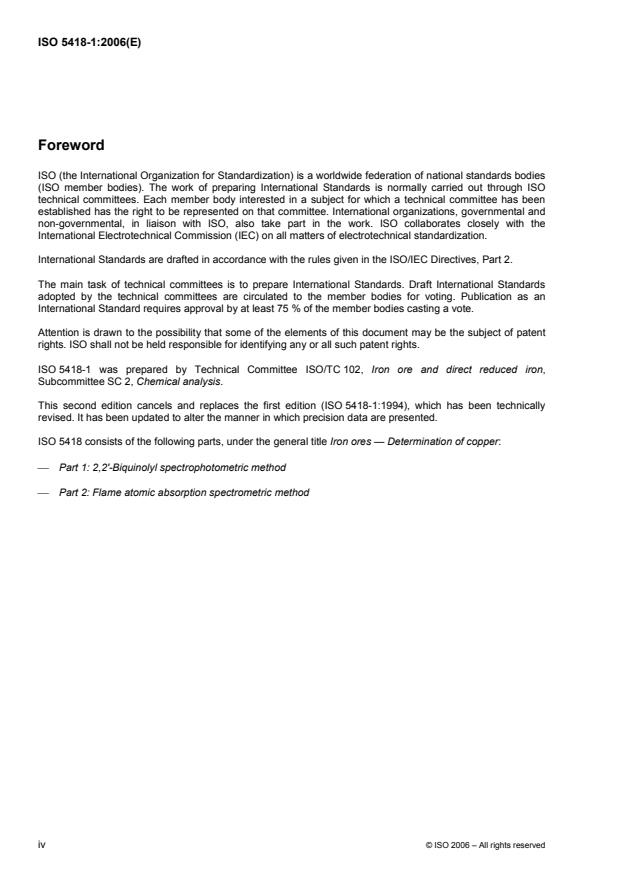ISO 5418-1:2006 is a standard published by the International Organization for Standardization (ISO). Its full title is "Iron ores - Determination of copper - Part 1: 2,2'-Biquinolyl spectrophotometric method". This standard covers: ISO 5418-1:2006 specifies a 2,2'-biquinolyl spectrophotometric method for the determination of copper in iron ores. This method is applicable to mass fractions of copper between 0,005 % and 0,77 % in natural iron ores, iron ore concentrates and agglomerates, including sinter products.