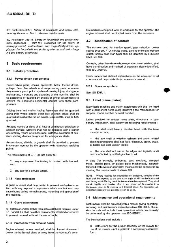 ISO 5395-2:1981 is a standard published by the International Organization for Standardization (ISO). Its full title is "Power lawn mowers, lawn tractors, and lawn and garden tractors with mowing attachments — Safety requirements and test procedures — Part 2: Basic requirements". This standard covers: Power lawn mowers, lawn tractors, and lawn and garden tractors with mowing attachments — Safety requirements and test procedures — Part 2: Basic requirements
