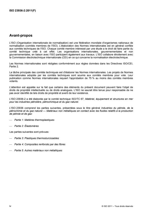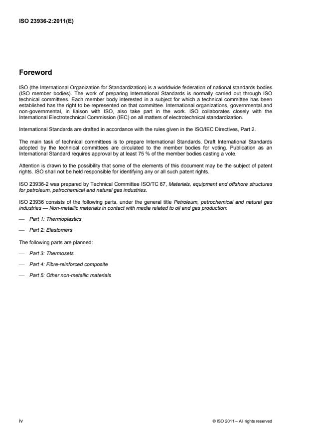 ISO 23936-2:2011 is a standard published by the International Organization for Standardization (ISO). Its full title is "Petroleum, petrochemical and natural gas industries - Non-metallic materials in contact with media related to oil and gas production - Part 2: Elastomers". This standard covers: ISO 23936 describes general principles and gives requirements and recommendations for the selection and qualification of non-metallic materials for service in equipment used in oil and gas production environments, where the failure of such equipment could pose a risk to the health and safety of the public and personnel, or to the environment. It can be applied to help avoid failures of the equipment itself. It supplements, but does not replace, the material requirements given in the appropriate design codes, standards or regulations. ISO 23936-2:2011 describes the requirements and procedures for qualification of elastomeric material used in equipment for oil and gas production.