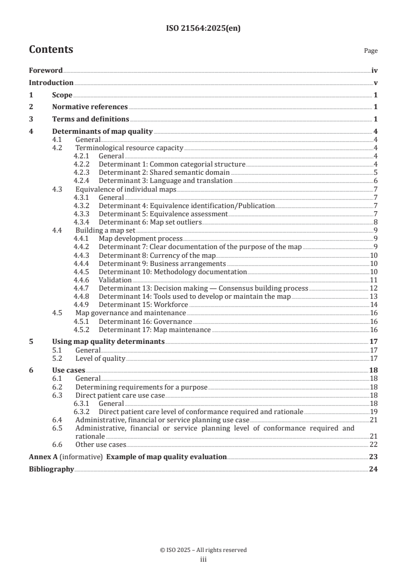ISO 21564:2025 is a standard published by the International Organization for Standardization (ISO). Its full title is "Health informatics - Terminology resource map quality measures and requirements (MapQual)". This standard covers: This document provides quality requirements for producing a quality map between terminological systems. This document establishes measures which can be used to assess the quality and utility of a map between terminological resources. These measures can be used to determine the types and conformance levels of a map and their impact on common use cases in healthcare.
