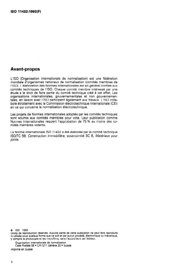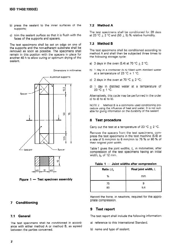 ISO 11432:1993 is a standard published by the International Organization for Standardization (ISO). Its full title is "Building construction — Sealants — Determination of resistance to compression". This standard covers: The principle of the method specified is preparing test specimens in which the sealant to be tested adheres to two parallel contact surfaces, compressing the test specimens to a defined value under defined conditions and recording the applied force and the resulting stress.