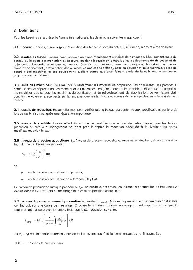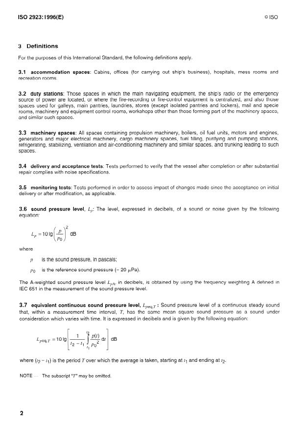 ISO 2923:1996 is a standard published by the International Organization for Standardization (ISO). Its full title is "Acoustics - Measurement of noise on board vessels". This standard covers: Describes techniques and conditions for the measurement of noise on board vessels. The results may be used to compare various vessels, in acceptance tests for comparison with national and international legislation, in monitoring tests, as a basis for further investigations and to assess the audibility of acoustical alarms.