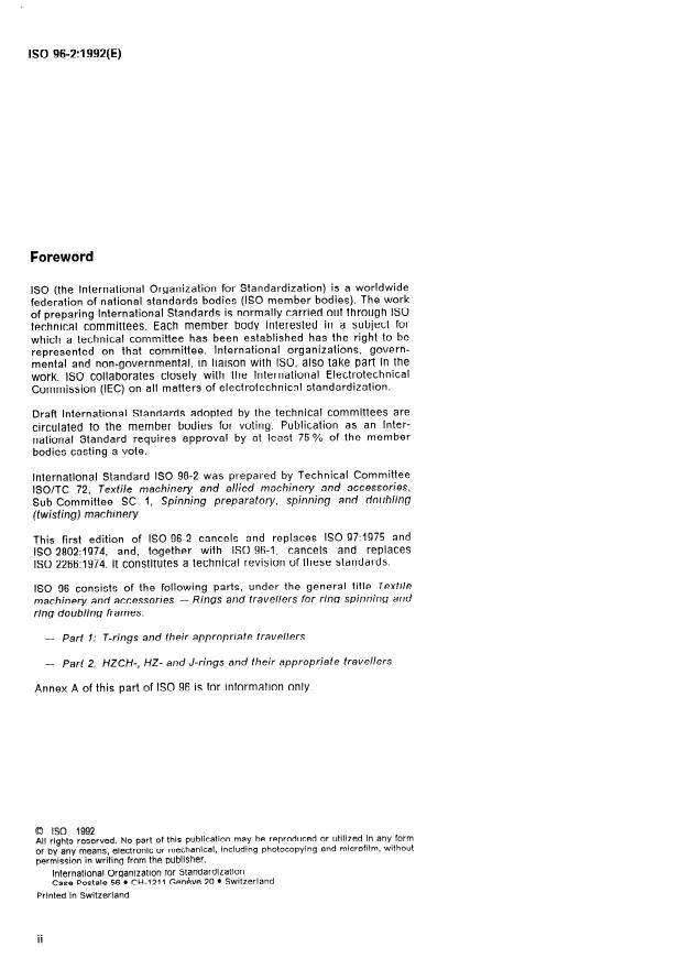 ISO 96-2:1992 is a standard published by the International Organization for Standardization (ISO). Its full title is "Textile machinery and accessories — Rings and travellers for ring spinning and ring doubling frames — Part 2: HZCH-, HZ- and J-rings and their appropriate travellers". This standard covers: Specifies the principal dimensions of HZCH-, HZ- and J-rings, the mass, the tolerance on the mass, wire section, range of numbers of the appropriate travellers for these rings. Includes the designation method for the travellers.