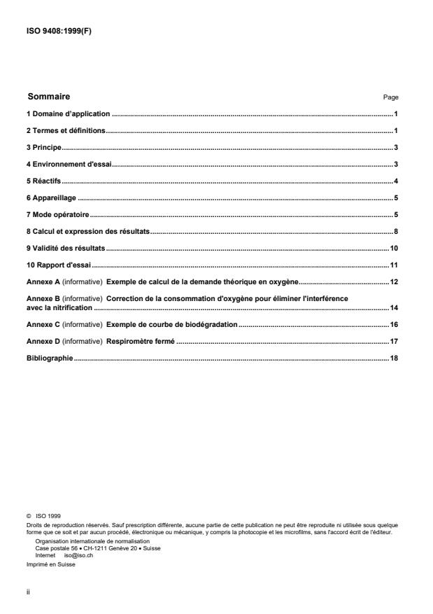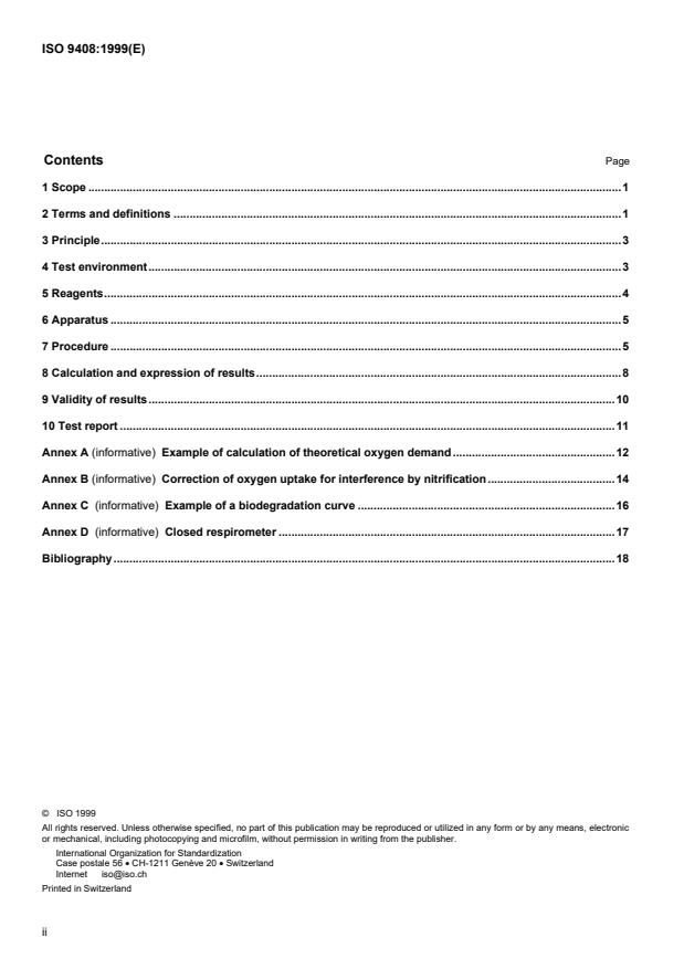 Annexes in ISO 9408 provide calculation examples, nitrification corrections, biodegradation curves and respirometer guidance.