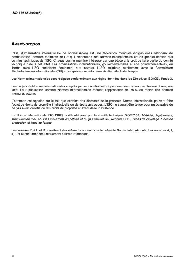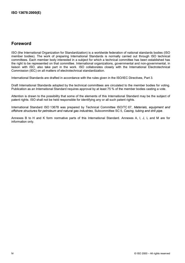 ISO 13678:2000 is a standard published by the International Organization for Standardization (ISO). Its full title is "Petroleum and natural gas industries — Evaluation and testing of thread compounds for use with casing, tubing and line pipe". This standard covers: Petroleum and natural gas industries — Evaluation and testing of thread compounds for use with casing, tubing and line pipe