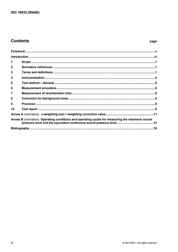 ISO 16032:2004 specifies methods for measuring the sound-pressure level produced by service equipment attached to or installed in buildings. It specifically covers measurements on sanitary installations, mechanical ventilation, heating and cooling service equipment, lifts, rubbish chutes, boilers, blowers, pumps and other auxiliary service equipment, and motor-driven car park doors, but can also be applied to other equipment attached to or installed in buildings. The methods are suitable for rooms with volumes of approximately 300 cubic metres or less in e.g. dwellings, hotels, schools, offices and hospitals. The standard is not in general intended for measurements in large auditoria such as concert halls. However, the operating conditions and operating cycles in Annex B can be used in such cases. The service equipment sound-pressure level is determined as the maximum A-weighted and optionally C-weighted sound-pressure level occurring during a specified operation cycle of the service equipment under test, or as the equivalent continuous sound-pressure level determined with a specified integration time. A-weighted and C-weighted values are calculated from octave-band measurements.