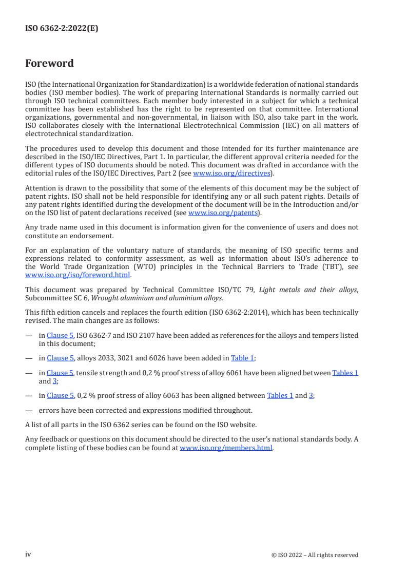 - Tempers and alloys: Temper designations follow ISO 2107; alloy listings refer to ISO 6362-7. Annex B lists tempers used in the tables.