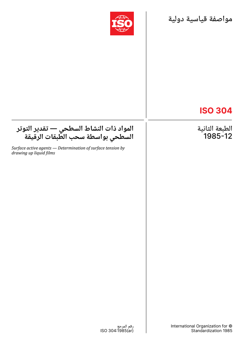 ISO 304:1985 - Surface active agents — Determination of surface tension by drawing up liquid films Released:12/19/1985