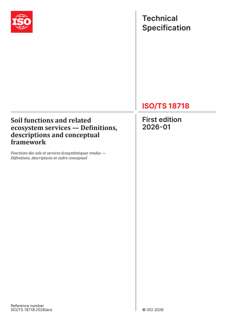 ISO/TS 18718:2026 is a technical specification published by the International Organization for Standardization (ISO). Its full title is "Soil functions and related ecosystem services — Definitions, descriptions and conceptual framework". This standard covers: This document provides definitions, descriptions and a framework for the assessment of ecological soil functions and of related ecosystem services, based on a review of existing documents. It describes the main characteristics of key ecological soil functions and how they relate to soil characteristics and to ecosystem services. This document does not cover non-ecological soil functions, e.g. the support of infrastructures and archives, the provision of raw material.