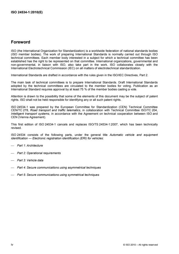 ISO 24534-1:2010 is a standard published by the International Organization for Standardization (ISO). Its full title is "Automatic vehicle and equipment identification — Electronic registration identification (ERI) for vehicles — Part 1: Architecture". This standard covers: ISO 24534-1:2010 provides requirements for electronic registration identification (ERI) that are based on an identifier assigned to a vehicle (e.g. for recognition by national authorities), suitable to be used for: electronic identification of local and foreign vehicles by national authorities; vehicle manufacturing, in-life maintenance and end-of-life identification (vehicle life cycle management); adaptation of vehicle data (e.g. for international resales); safety-related purposes; crime reduction; commercial services. It adheres to privacy and data protection regulations. ISO 24534-1:2010 provides an overview of the ERI system concept, in terms of the onboard vehicle components and the external off-vehicle components required for an operational system. The detailed requirements are defined in Parts 2, 3, 4 and 5 of ISO 24534 and more limited, though relevant, provisions are defined in ISO 24535.