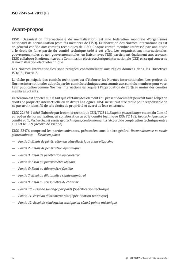 L'ISO 22476-4:2012 spécifie des exigences relatives à l'équipement, à l'exécution et aux rapports pour un essai au pressiomètre Ménard. Elle décrit la procédure pour conduire un essai au pressiomètre Ménard dans des sols naturels, dans des couches traitées ou non traitées et dans des roches fragiles, sur terre ou en milieu maritime. Les résultats des essais permettent une détermination quantitative de la résistance du sol et des paramètres de déformation. Ils peuvent fournir des informations lithologiques. Ils peuvent aussi être combinés avec des investigations directes (par exemple des essais conformes à l'ISO 22475-1 ou comparés à d'autres essais in-situ (voir l'EN 1997-2:2007, 2.4.1.4 P, 4.1 (1) P et 4.2.3(2) P). L'essai au pressiomètre Ménard est réalisé par la dilatation radiale d'une sonde tricellulaire placée dans le sol. Au cours de l'injection de liquide dans la sonde, la dilatation des trois cellules provoque d'abord l'entrée en contact de la gaine de la sonde avec les parois du trou de forage, puis y exerce une pression, ce qui donne lieu à un refoulement du sol. La pression appliquée à la sonde et la dilatation volumique associée de cette dernière sont mesurées et enregistrées de manière à déterminer la relation contrainte-déformation du sol lors de l'essai. Conjointement avec les résultats des investigations conformes à l'ISO 22475-1 disponibles, ou au moins avec l'identification et la description du sol conformément à l'ISO 14688-1 et à l'ISO 14689-1 obtenues lors des opérations d'essai au pressiomètre, les résultats d'essai du présent document conviennent pour la caractérisation quantitative du profil de sol, qui inclut le module Ménard (EM) la pression limite (pLM) et la pression de fluage Ménard (pf). L'ISO 22476-4:2012 fait référence à une sonde décrite historiquement comme la sonde de type G de 60 mm. Elle s'applique à des profondeurs d'essai limitées à 50 m et à une pression d'essai ne dépassant pas 5 MPa.