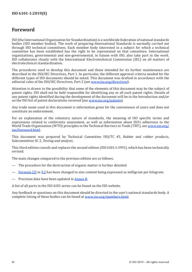 ISO 6101-1:2019 specifies an atomic absorption spectrometric (AAS) method for the determination of zinc content in rubber. It applies to raw rubber and rubber products with zinc contents of at least 0.05% (mass fraction); lower concentrations can be measured by adjusting sample mass, solution concentrations or by using the standard additions method to improve detection limits. The method replaces the 1991 edition and clarifies organic-matter destruction, result expression and precision data.