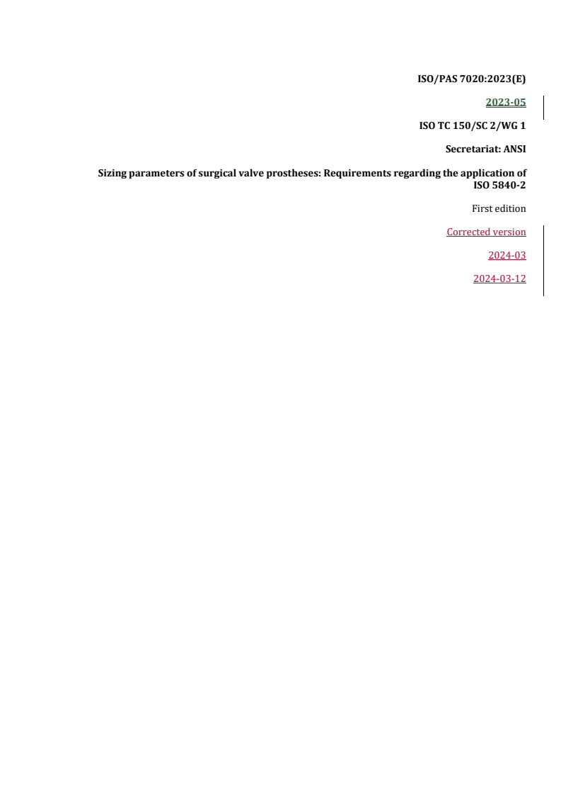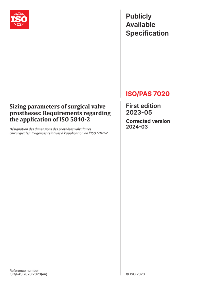 ISO/PAS 7020:2023 - Sizing parameters of surgical valve prostheses: Requirements regarding the application of ISO 5840-2 Released:3/27/2024