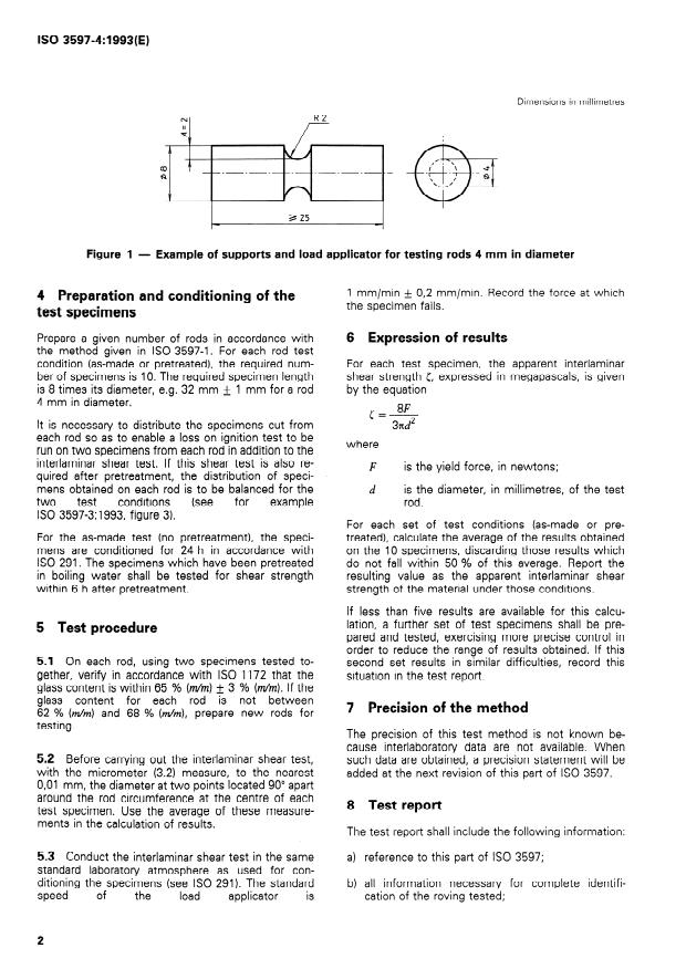 ISO 3597-4:1993 is a standard published by the International Organization for Standardization (ISO). Its full title is "Textile-glass-reinforced plastics — Determination of mechanical properties on rods made of roving-reinforced resin — Part 4: Determination of apparent interlaminar shear strength". This standard covers: Specifies a test method for determining the apparent interlaminar shear strength of composite rods of circular cross-section made of roving-reinforced resin. It may be carried out on as-made rods or on rods that have been pretreated by immersion in boiling water for a specified time and is intended for inspection and quality control of rovings. The results obtained are not intended for the generation of design data.
