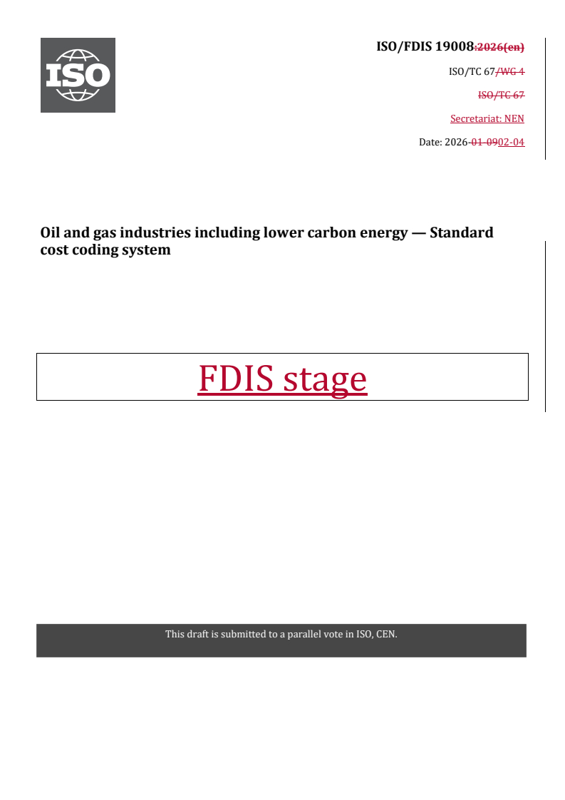 ISO/FDIS 19008 - Oil and gas industries including lower carbon energy — Standard cost coding system Released:5. 02. 2026
