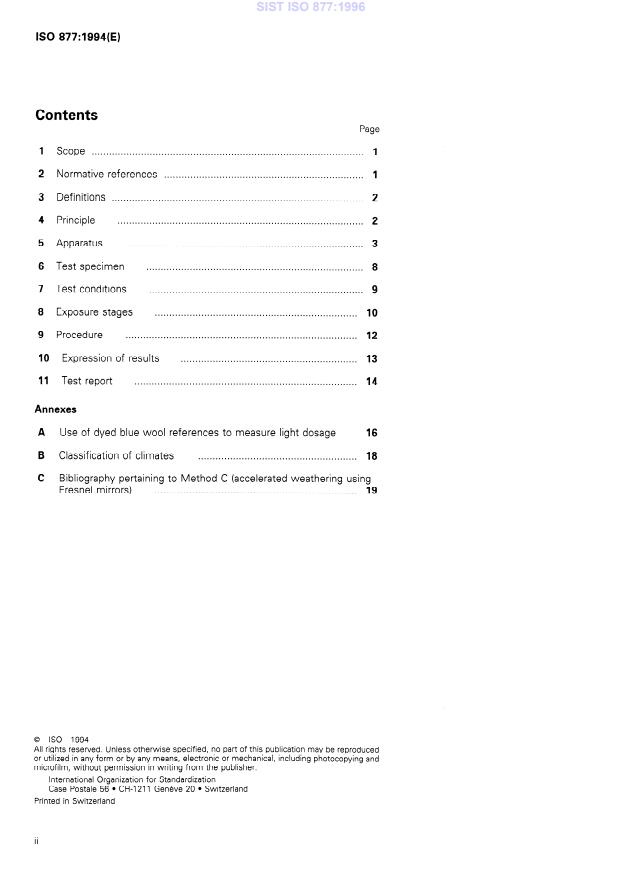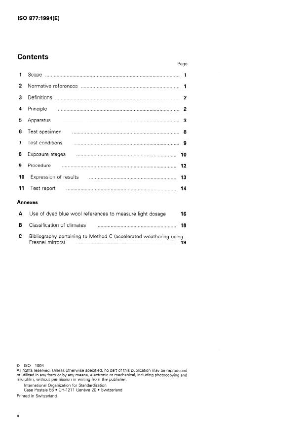 ISO 877:1994 is a standard published by the International Organization for Standardization (ISO). Its full title is "Plastics — Methods of exposure to direct weathering, to weathering using glass-filtered daylight, and to intensified weathering by daylight using Fresnel mirrors". This standard covers: Cancels and replaces the first edition (1976). Specifies methods of exposing plastics to solar radiation, either by direct exposure to natural weathering (Method A), to indirect solar radiation by modification of its spectral distribution with glass to simulate ageing of plastics behind building or automotive window glass (Method B), or to solar radiation intensified by the use of Fresnel mirrors to achieve acceleration of the weathering processes (Method C). Specifies the general requirements for the apparatus and operating procedures for using the test methods described and methods for determining radiation dosage. Applicable to plastics materials of all kinds and to products and portions of products.