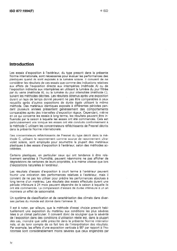 ISO 877:1994 - Plastiques -- Méthodes d'exposition directe aux intempéries, ou d'exposition indirecte sous verre, et a la lumiere du jour intensifiée par des miroirs de Fresnel