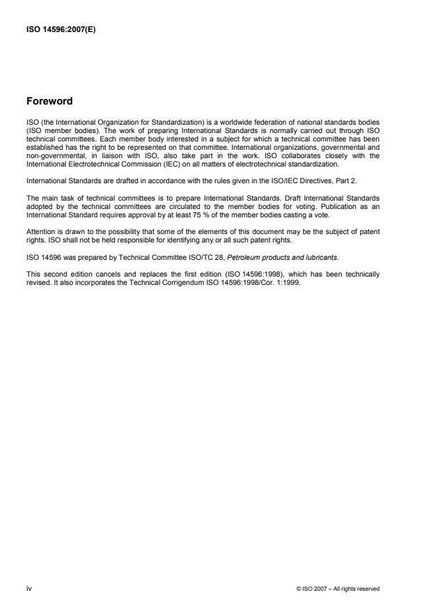 ISO 14596:2007 is a standard published by the International Organization for Standardization (ISO). Its full title is "Petroleum products — Determination of sulfur content — Wavelength-dispersive X-ray fluorescence spectrometry". This standard covers: ISO 14596:2007 specifies a method for the determination of the sulfur content of liquid petroleum products, additives for petroleum products, and semi-solid and solid petroleum products that are either liquefied by moderate heating or soluble in organic solvents of negligible or accurately known sulfur content. The method is applicable to products or additives having sulfur contents in the range 0,001 % (m/m) to 2,50 % (m/m); higher contents can be determined by appropriate dilution. Other elements do not interfere at concentrations anticipated in the materials subject to this analysis.