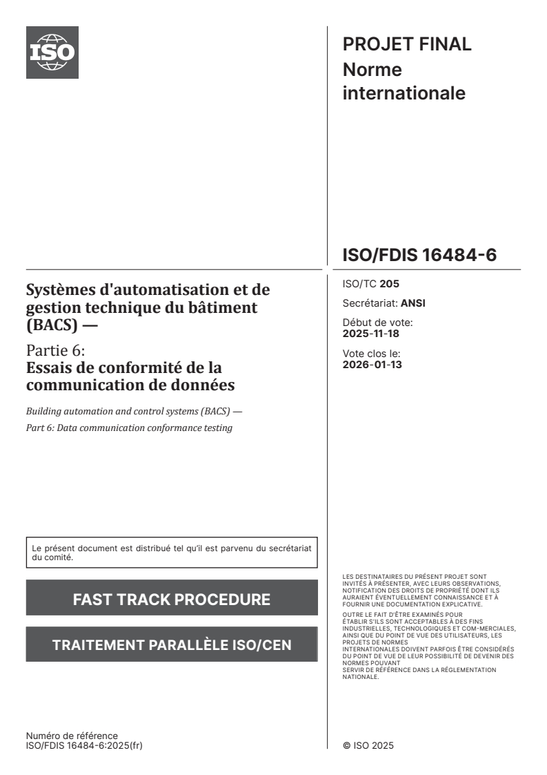 ISO/FDIS 16484-6 - Systèmes d'automatisation et de gestion technique du bâtiment (BACS) — Partie 6: Essais de conformité de la communication de données Released:31. 12. 2025