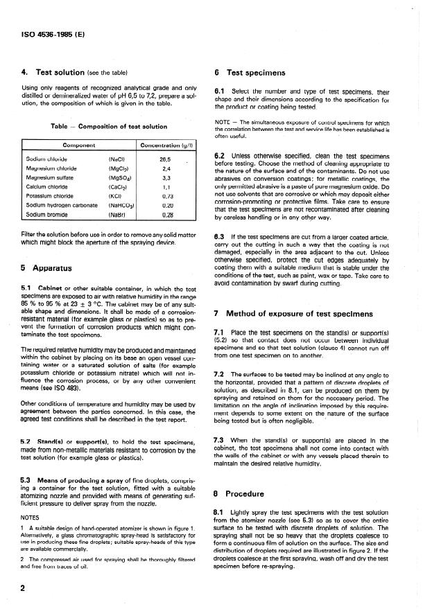 ISO 4536:1985 is a standard published by the International Organization for Standardization (ISO). Its full title is "Metallic and non-organic coatings on metallic substrates - Saline droplets corrosion test (SD test)". This standard covers: Specifies the test solution, the apparatus and the procedure for a saline droplets corrosion test. Is suitable for detecting defests and discontinuities. It is also suitable for chemical or electrochemical conversion coatings. Is not suitable for testing coatings intended for the more severe types of service. The type and number of test specimens, the exposure periods to be used for a particular product and the interpretaiton of results are not specified.