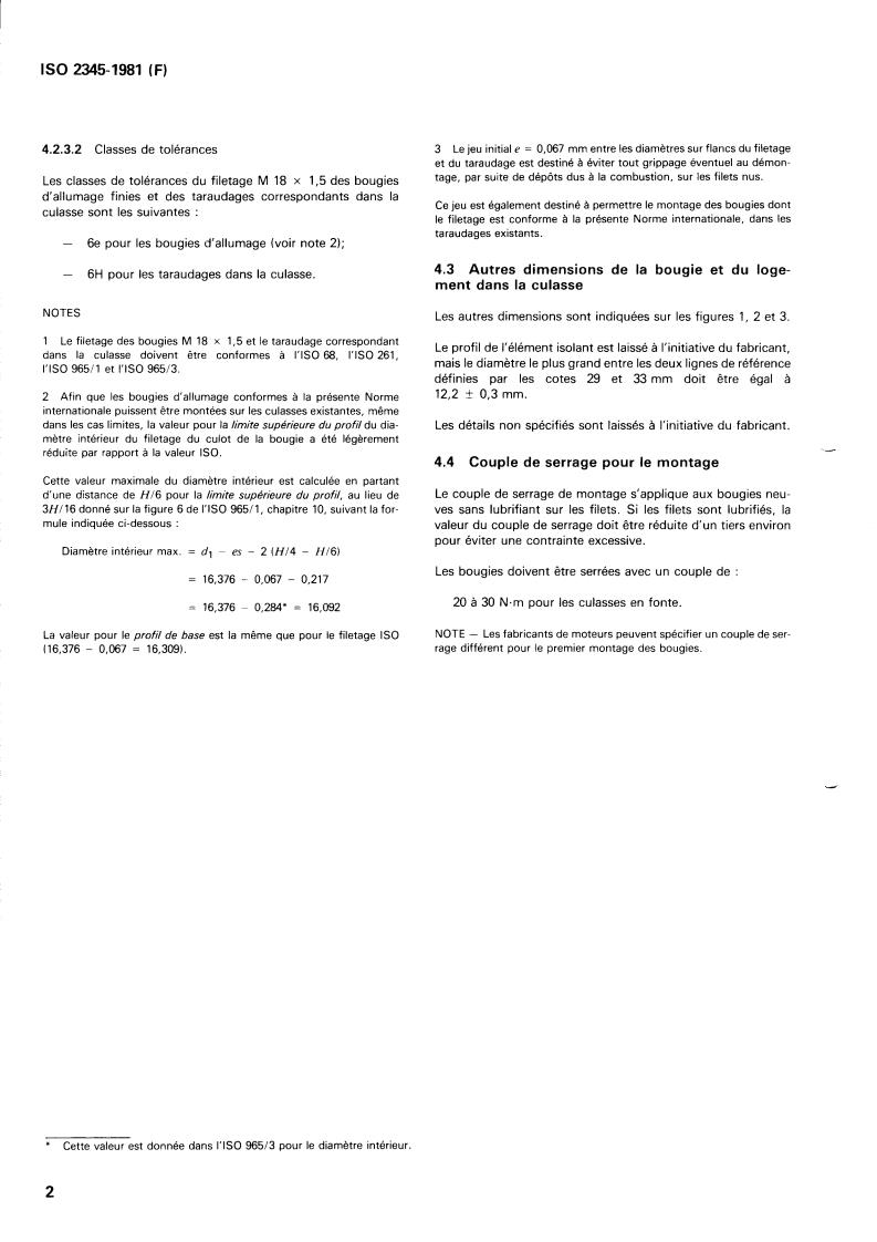 ISO 2345:1981 is a standard published by the International Organization for Standardization (ISO). Its full title is "Road vehicles — Spark plugs M 18 x 1,5 with conical seating and their cylinder head housing". This standard covers: Road vehicles — Spark plugs M 18 x 1,5 with conical seating and their cylinder head housing