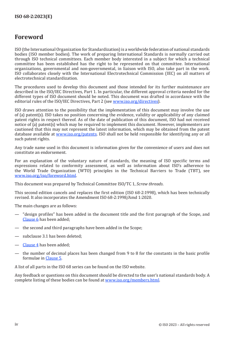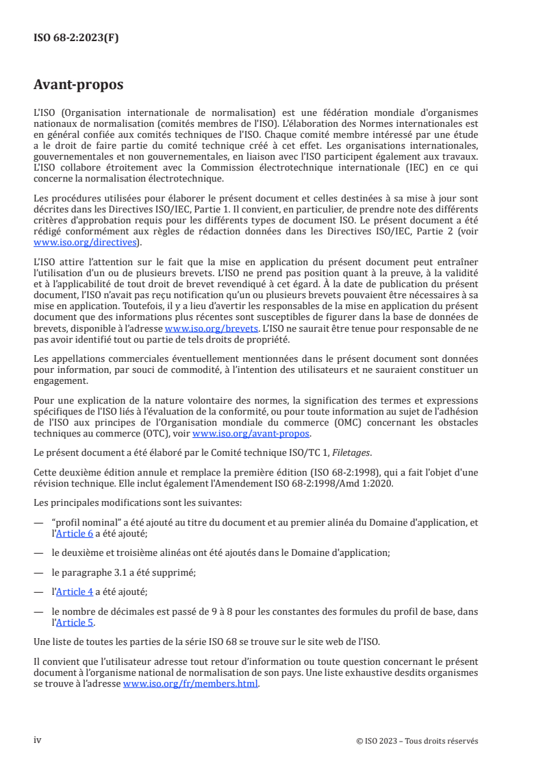 Cette deuxième édition annule et remplace la première édition (ISO 68-2:1998), qui a fait l'objet d'une