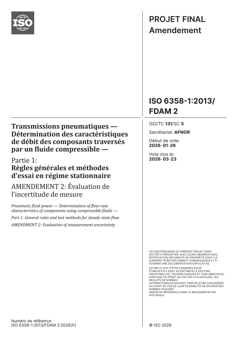 ISO 6358-1:2013/FDAmd 2 - Pneumatic fluid power — Determination of flow-rate characteristics of components using compressible fluids — Part 1: General rules and test methods for steady-state flow — Amendment 2: Evaluation of measurement uncertainty Released:12. 01. 2026