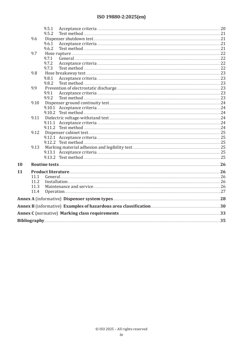 - Performance and verification: Qualification and routine tests (proof pressure, leakage, impact, hose rupture/breakaway, electrostatic prevention, ground continuity, dielectric, cabinet tests) and acceptance criteria.