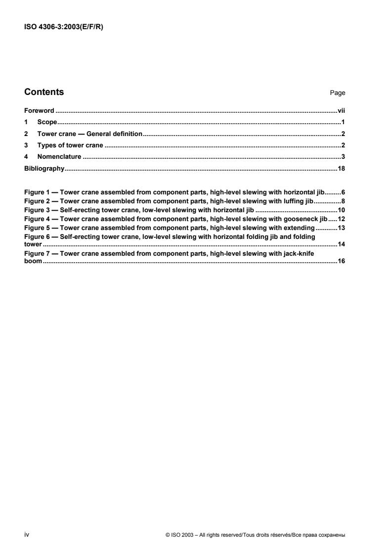 ISO 4306 establishes definitions in English, French and Russian for the most commonly used terms in the field of cranes. ISO 4306-3:2002 gives the general definition of a tower crane and illustrates the terminology used with each type of tower crane by the use of figures with referenced term numbers. It is applicable to tower cranes that can be assembled and dismantled; permanently erected tower cranes; It is not applicable to mobile boom cranes which may be fitted with a tower attachment; erection masts, with or without jibs.