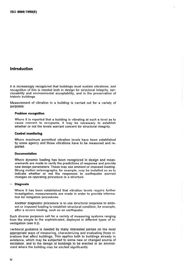ISO 4866:1990 is a standard published by the International Organization for Standardization (ISO). Its full title is "Mechanical vibration and shock — Vibration of buildings — Guidelines for the measurement of vibrations and evaluation of their effects on buildings". This standard covers: Mechanical vibration and shock — Vibration of buildings — Guidelines for the measurement of vibrations and evaluation of their effects on buildings