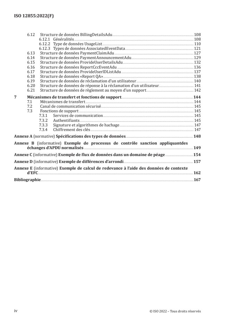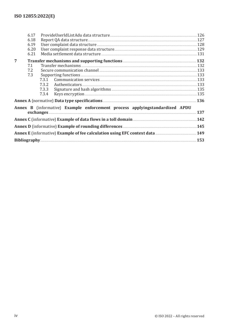 - Scope exclusions (important): ISO 12855:2022 does NOT specify communication outside the TC/TSP back‑office pair, public-transport EFC interfaces, payment processes or fiscal/legal accounting workflows, nor does it mandate service communication channels or full multi-step transaction flows.
