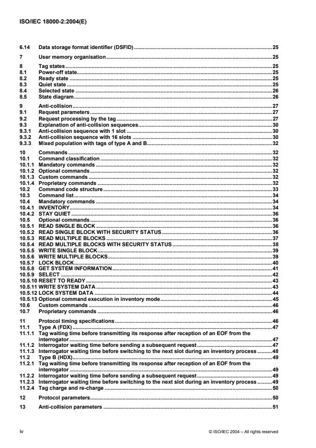ISO/IEC 18000-2:2004 is a standard published by the International Organization for Standardization (ISO). Its full title is "Information technology — Radio frequency identification for item management — Part 2: Parameters for air interface communications below 135 kHz". This standard covers: ISO/IEC 18000-2:2004 defines the air interface for radio-frequency identification (RFID) devices operating below 135 kHz used in item management applications. Its purpose is to provide a common technical specification for RFID devices to allow for compatibility and to encourage inter-operability of products for the growing RFID market in the international marketplace. ISO/IEC 18000-2:2004 defines the forward and return link parameters for technical attributes including, but not limited to, operating frequency, operating channel accuracy, occupied channel bandwidth, spurious emissions, modulation, duty cycle, data coding, bit rate, bit rate accuracy, bit transmission order. It further defines the communications protocol used in the air interface. ISO/IEC 18000-2:2004 contains two types. The detailed technical differences between the types are shown in the parameter tables. ISO/IEC 18000-2:2004 specifies the physical layer that is used for communication between the interrogator and the tag; the protocol and the commands; the method to detect and communicate with one tag among several tags ("anti-collision"). It specifies two types of tags: Type A (FDX) and Type B (HDX). These two types differ only by their physical layer. Both types support the same anti-collision and protocol. FDX tags are permanently powered by the interrogator, including during the tag-to-interrogator transmission. They operate at 125 kHz. HDX tags are powered by the interrogator, except during the tag-to-interrogator transmission. They operate at 134,2 kHz. An alternative operating frequency is described. An optional anti-collision mechanism is also described.