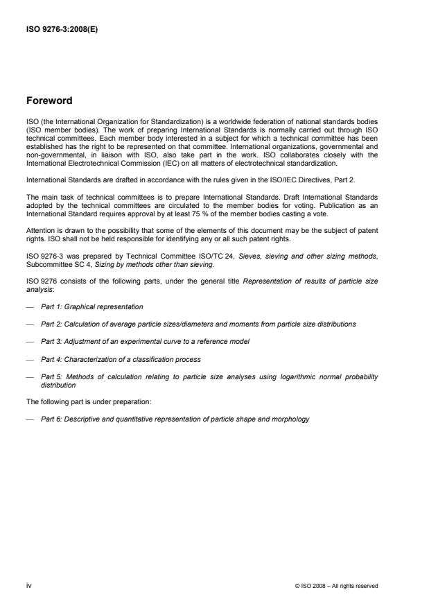 ISO 9276-3:2008 is a standard published by the International Organization for Standardization (ISO). Its full title is "Representation of results of particle size analysis - Part 3: Adjustment of an experimental curve to a reference model". This standard covers: ISO 9276-3:2008 specifies methods for the adjustment of an experimental curve to a reference model with respect to a statistical background. Furthermore, the evaluation of the residual deviations, after the adjustment, is also specified. The reference model can also serve as a target size distribution for maintaining product quality. ISO 9276-3:2008 specifies procedures that are applicable to the following reference models: a) normal distribution (Laplace-Gauss): powders obtained by precipitation, condensation or natural products (pollens); b) log-normal distribution (Galton MacAlister): powders obtained by grinding or crushing; c) Gates-Gaudin-Schuhmann distribution (bilogarithmic): analysis of the extreme values of the fine particle distributions; d) Rosin-Rammler distribution: analysis of the extreme values of the coarse particle distributions; e) any other model or combination of models, if a non-linear fit method is used. ISO 9276-3:2008 can substantially support product quality assurance or process optimization related to particle size distribution analysis.