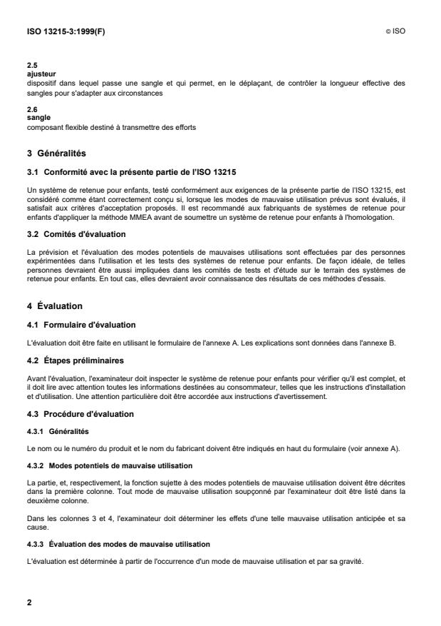 This part of ISO 13215 specifies a method to predict and quantify misuse of child restraint systems which is called Misuse Mode and Effect Analysis (MMEA). Such misuse may degrade the performance of child restraint systems. As a predictive method it should be applied at an early stage, before the child restraint system is put into use by consumers. The MMEA method is recommended to be used by manufacturers of child restraint systems. However, in order to further minimize misuse of child restraint systems, this method may also be used for type approval purposes. Being predictive implies the possibility of incompleteness and errors. Such errors can be minimized, if the proposed method is supported by the panel method [1] and by field studies. This part of ISO 13215 represents the best present consensus, but should be reviewed more frequently than other International Standards and revised in the light of increasing experience.