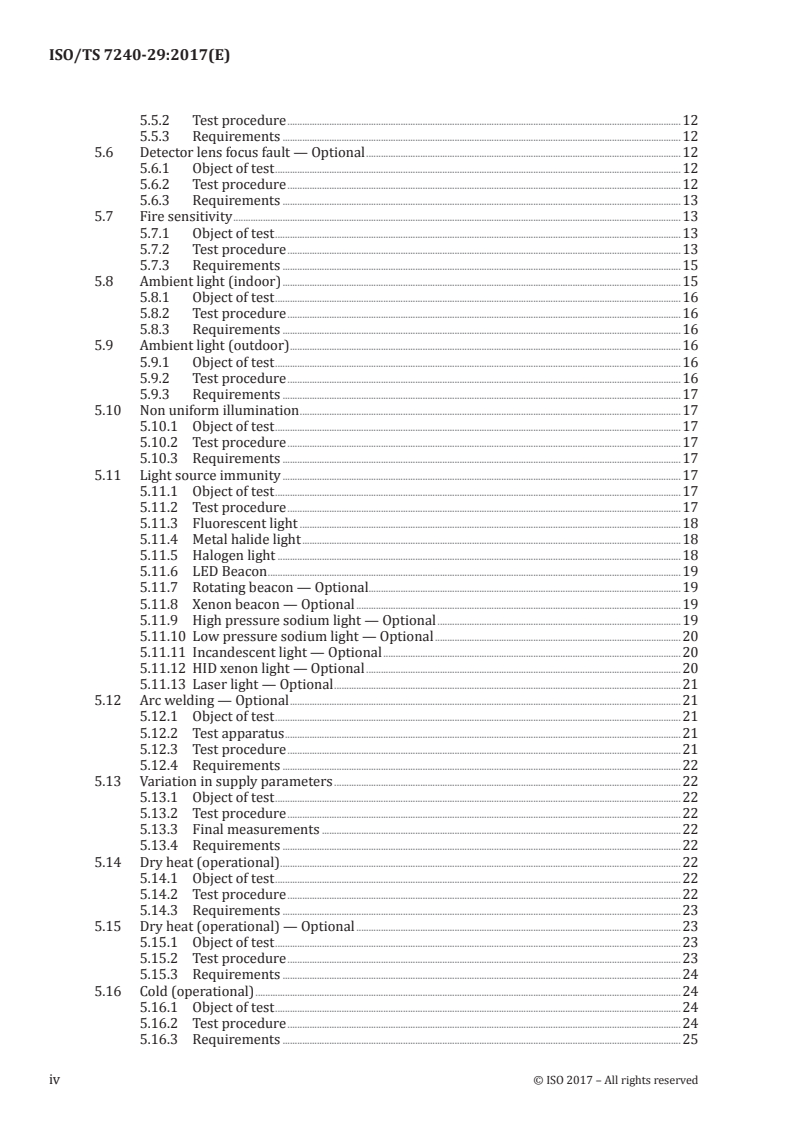ISO/TS 7240-29:2017 is a technical specification published by the International Organization for Standardization (ISO). Its full title is "Fire detection and alarm systems - Part 29: Video fire detectors". This standard covers: ISO/TS 7240-29:2017 specifies requirements, test methods and performance criteria for video fire detectors (VFD), which operate in the visible spectrum, for use in fire detection and alarm systems installed in and around buildings (see ISO 7240‑1). For the testing of other types of VFD working on different principles, ISO/TS 7240-29:2017 can be used only for guidance. Detectors developed for the protection of specific risks that incorporate special characteristics (including additional features or enhanced functionality for which ISO/TS 7240-29:2017 does not define a test or assessment method) are beyond the scope of ISO/TS 7240-29:2017.