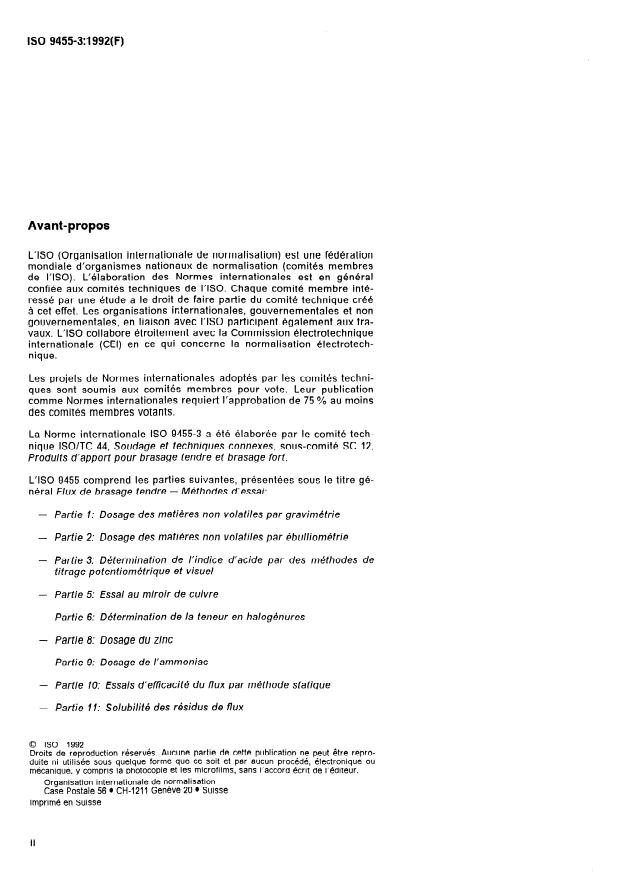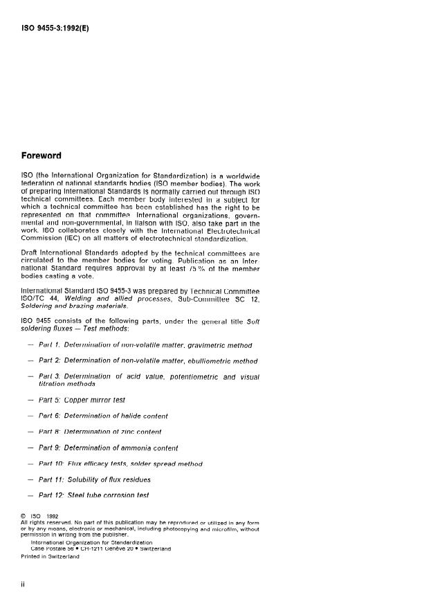 ISO 9455-3:1992 is a standard published by the International Organization for Standardization (ISO). Its full title is "Soft soldering fluxes — Test methods — Part 3: Determination of acid value, potentiometric and visual titration methods". This standard covers: Specifies the two methods for a flux of types 1 and 2 only, as defined in ISO 9454-1. Gives precision of the two methods as determined by interlaboratory tests.