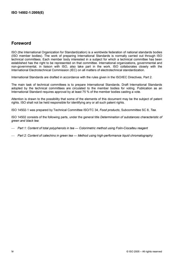 ISO 14502-1:2005 is a standard published by the International Organization for Standardization (ISO). Its full title is "Determination of substances characteristic of green and black tea - Part 1: Content of total polyphenols in tea - Colorimetric method using Folin-Ciocalteu reagent". This standard covers: ISO 14502-1:2005 specifies a method for the determination of the total polyphenol content of leaf teas and instant teas by a colorimetric assay using Folin-Ciocalteu phenol reagent. It is applicable to both green and black tea products.