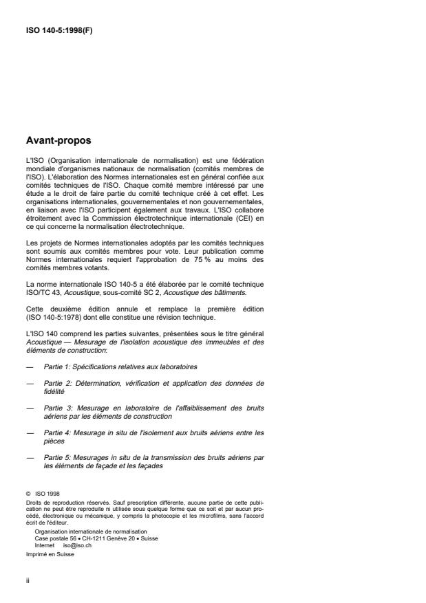 ISO 140-5:1998 is a standard published by the International Organization for Standardization (ISO). Its full title is "Acoustics — Measurement of sound insulation in buildings and of building elements — Part 5: Field measurements of airborne sound insulation of façade elements and façades". This standard covers: Acoustics — Measurement of sound insulation in buildings and of building elements — Part 5: Field measurements of airborne sound insulation of façade elements and façades